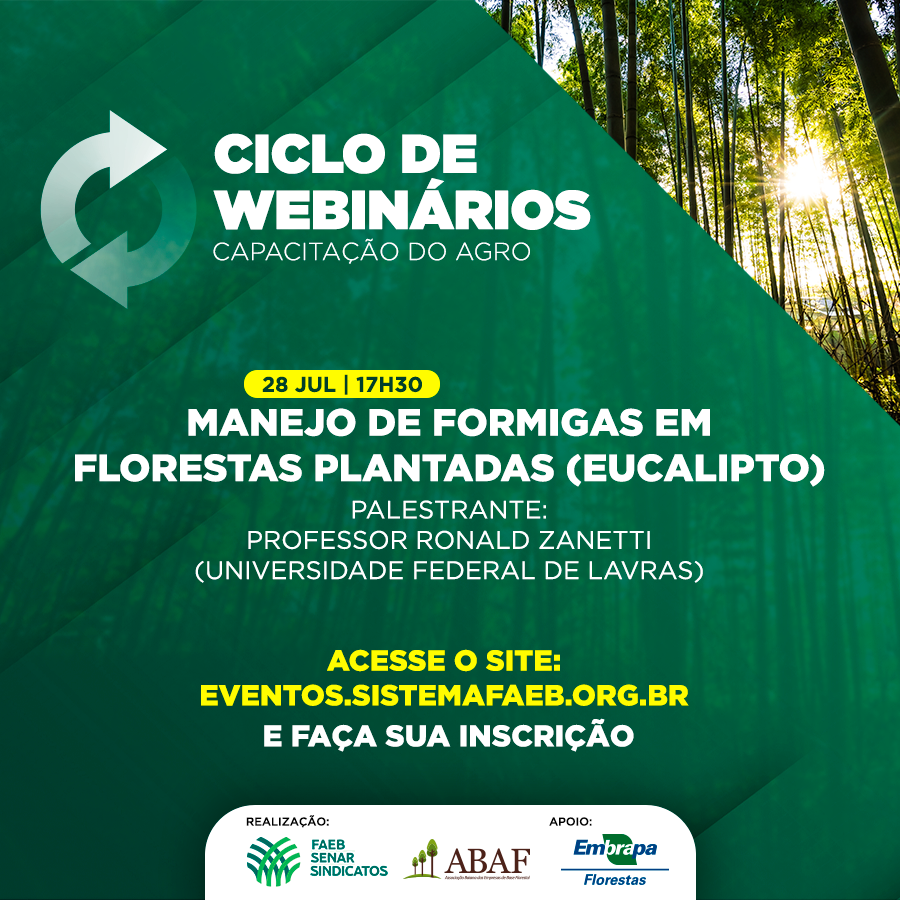 “Manejo integrado de formigas cortadeiras em florestas cultivadas” é o tema do segundo curso do ciclo de webinários “Capacitação do Agro” que o Sistema Faeb/Senar/Sindicatos realiza em parceria com a Associação Baiana das Empresas de Base Florestal (ABAF). Neste curso que acontece em 28/07, às 17h30, o engenheiro florestal Ronald Zanetti (Professor Titular do Departamento de […]