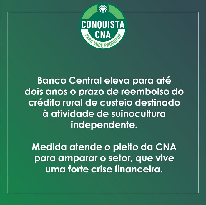 CMN atende CNA e amplia prazo de reembolso do custeio para suinocultores independentes