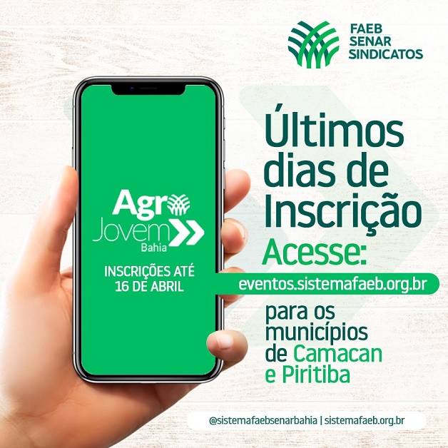O prazo para realizar as inscrições para o programa Agro Jovem Bahia nos municípios de Piritiba e Camacan está chegando ao fim. Os interessados tem até a sexta-feira, 16, para realizar as inscrições através do site http://eventos.https://sistemafaeb.org.br/wp-content/uploads/2023/07/cropped-1.png.org.br/ Em mais uma ação para fortalecer o protagonismo de jovens no setor agropecuário e capacitá-los para o mundo […]
