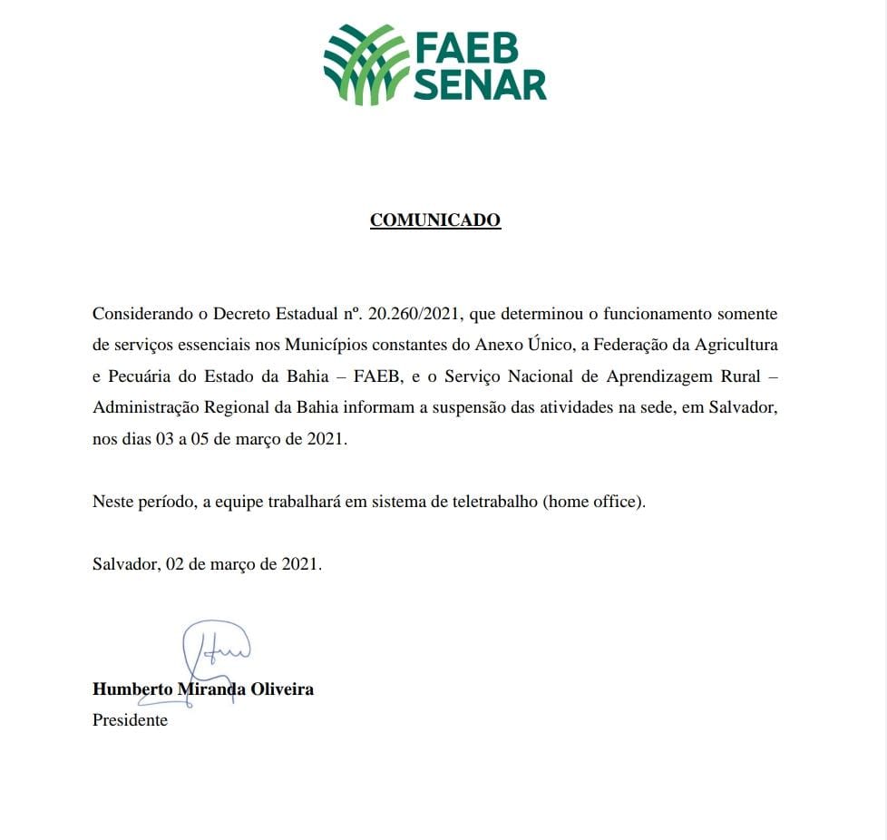 COMUNICADO IMPORTANTE – SISTEMA FAEB/SENAR