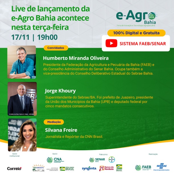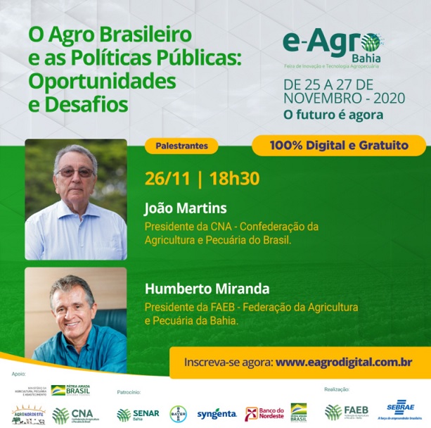 Com as presenças do presidente da CNA, João Martins, e do presidente da FAEB, Humberto Miranda, vamos conversar sobre as oportunidades e desafios do agro brasileiro e as políticas públicas! Tudo de maneira digital e 100% gratuito! • Agrotecnologia, smart farming e sustentabilidade• 100% digital e gratuito• Palestras e rodadas de negócio• Green Friday, a […]