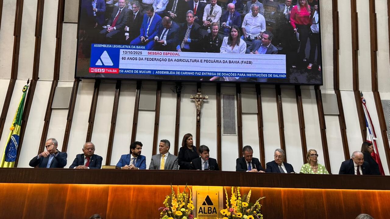 Os 60 anos da Federação da Agricultura e Pecuária da Bahia (Faeb) foram celebrados em uma sessão especial na Assembleia Legislativa da Bahia (Alba), nesta segunda-feira (13), em Salvador. A homenagem, proposta pelo deputado estadual Paulo Câmara, reuniu autoridades políticas e lideranças do setor produtivo baiano e nacional no plenário da Casa.
