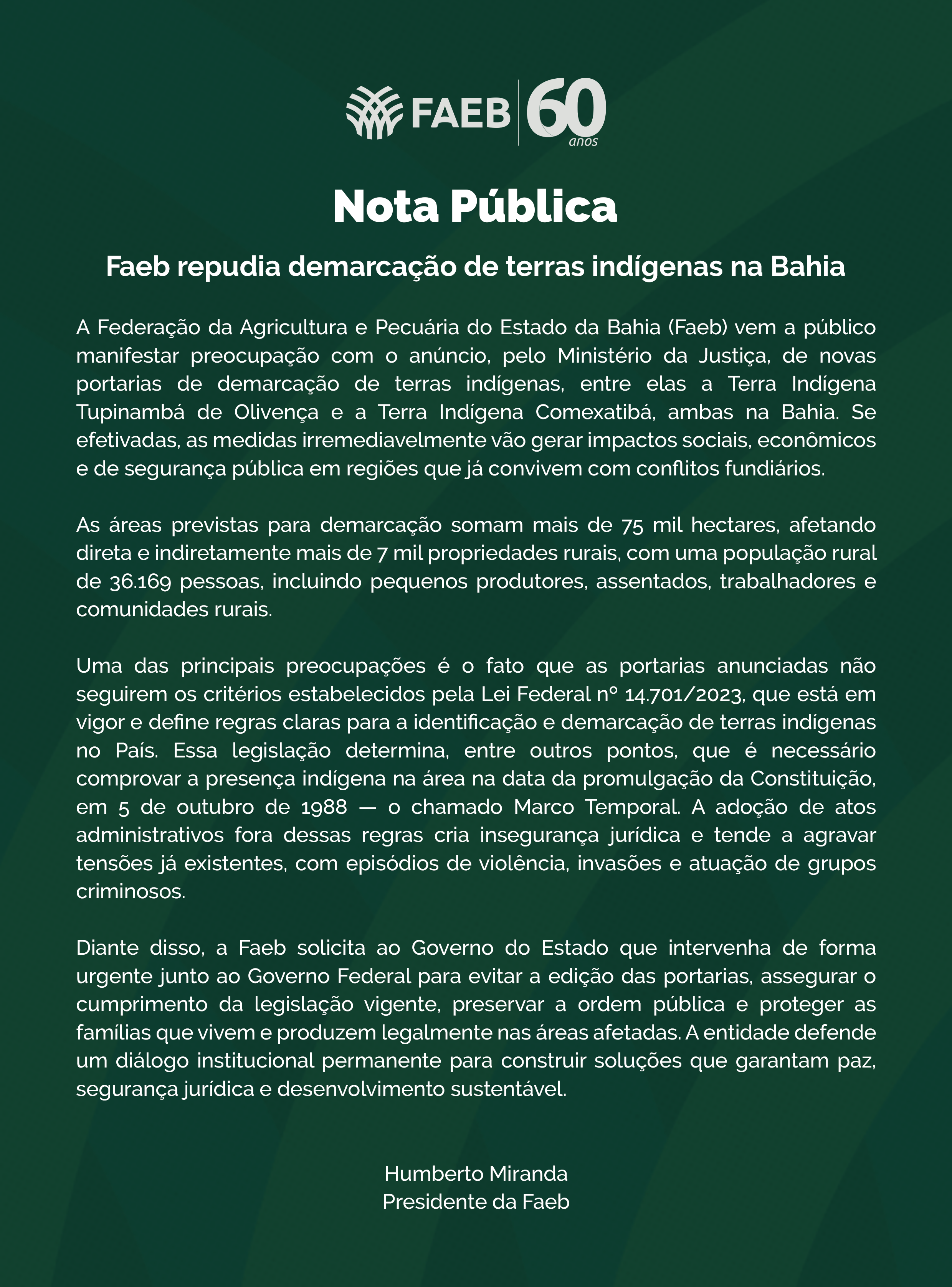 Nota pública: faeb repudia demarcação de terras indígenas na Bahia