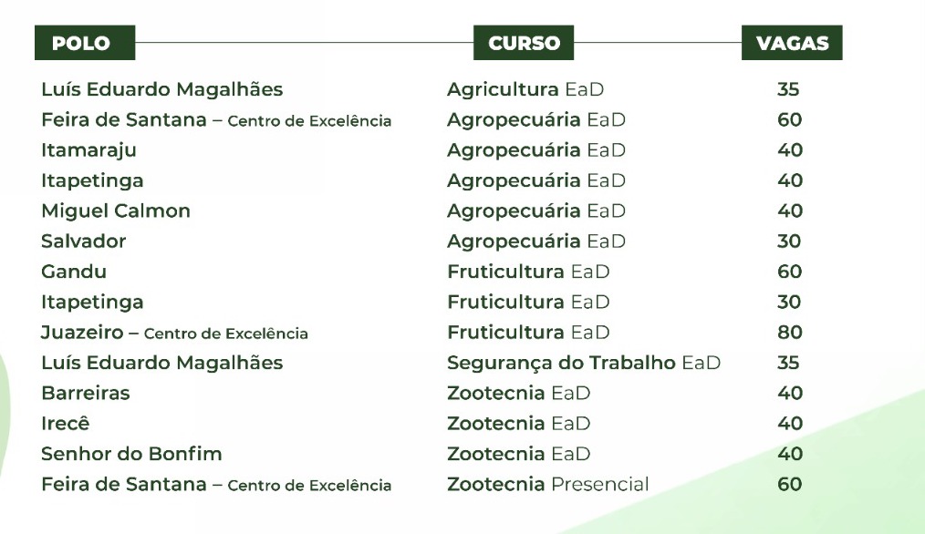 Entre os destaques, o curso de Zootecnia na modalidade presencial, oferecido em Feira de Santana, é a novidade do processo seletivo aberto. Na modalidade semipresencial, a capacitação é oferecida em Barreiras, Irecê e Senhor do Bonfim. Enquanto isso, o curso de Agropecuária está sendo ofertado em polos como Feira de Santana, Itamaraju, Itapetinga, Miguel Calmon, Salvador e outras cidades. Já o técnico em Fruticultura conta com vagas em Gandu, Itapetinga e Juazeiro.
